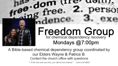 Our Freedom Group meets on Monday evenings at 7pm. It is a Bible-based chemical dependency group coordinated by our Elders Wayne & Patrice B. Contact the church office for more information.