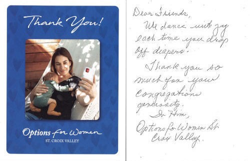 We are always accepting diaper and wipes donations for Options for Women-St. Croix Valley. As a church we're not anti-abortion but PRO-LIFE, and try to back that up by helping out mothers who choose life for their child. This is an easy way to do that. Organizationally we support Options with a monthly monetary donation, but diapers are one item they always need to help support the mothers relying on their services. Whenever you are shopping and pick some up, drop them off with Pastor Greg the next time you come to RVCC and he will make sure they get to OFW. According to their website, the most needed supplies right now are size 5 & 6 diapers, wipes, diaper ointment, and baby lotion and wash.