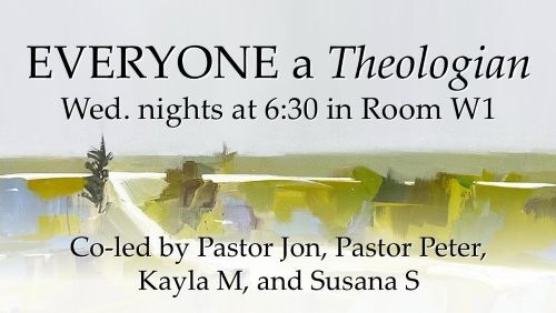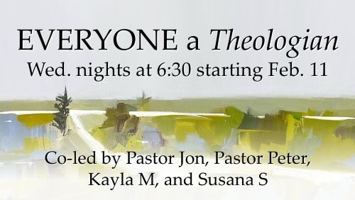 EVERYONE a Theologian will meet for six weeks 2/11, 2/18, 2/25, 3/11, 3/18, and 3/25 co-led by Pastor Jon, Pastor Peter & Kayla M, and Susana S.