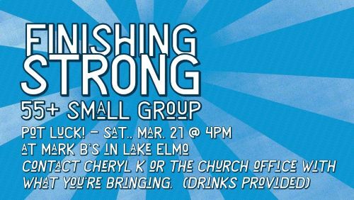 Our 55 years old and up "Finishing Strong" small group is having a potluck get-together Saturday afternoon, March 21 at 4pm at Mark B's home again. It's just minutes from the RVCC building, and they'd love for you to join them. Contact Cherly K directly, or the church office if you have questions, and to let them know what you're planning on bringing to the potluck. Beverages will be provided.