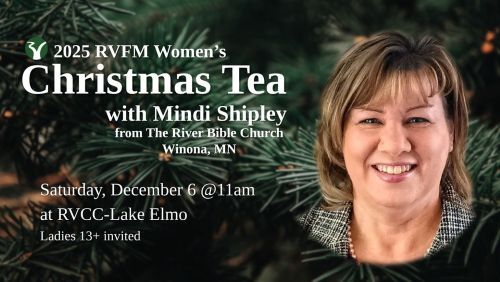 Our Women's Christmas Tea is coming up quickly!  Join us Saturday morning, December 6 at 11am with special guest Mindi Shipley from our sister RVFM church The River Bible Church in Winona, MN, where she ministers along with her husband, Pastor Matt Shipley.