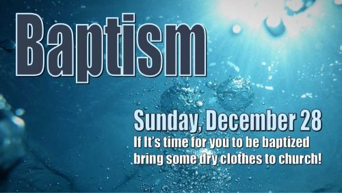 We've got baptisms scheduled to wrap up the year on Sunday, December 28! If you've not really understood the process and what it is all about, CLICK HERE for a teaching Pastor Jon did that explains it all. Contact the church office if you know now that it's time for you to be baptized.