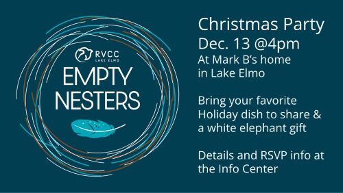Our Empty Nesters group is having a Christmas party Saturday, December 13 starting at 4pm at Mark B's home in Lake Elmo, just south of the church.