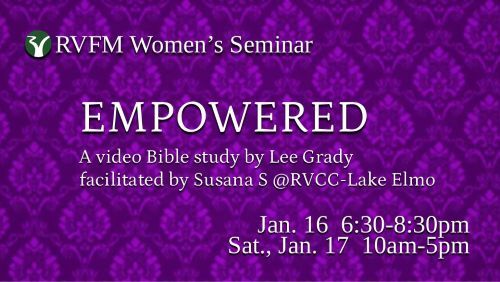 Susana S will be facilitating a Women's Seminar here at RVCC-Lake Elmo the weekend of January 16-17, starting at 6:30pm Friday evening, then 10am-5pm on Saturday. (Lunch will be provided)