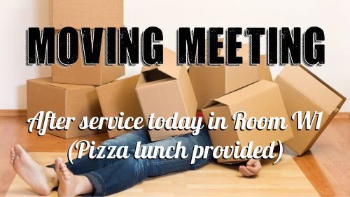 Pastor Peter will be leading a moving/packing/labeling meeting after service this week in Room W1. (Pizza lunch provided) This is open to anyone who's interested in helping out with packing, etc. for our impending move. He will be discussing the labeling system, process, and the upcoming timelines and moving order of things before we have to be out of our current building.